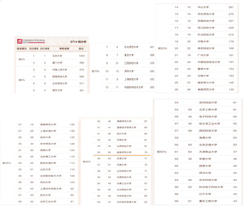 2022年9月21日,高等教育评价专业机构软科正式发布“2022软科中国最好学科排名”。排名榜单包括96个一级学科,各个学科排名的对象是在该一级学科设有学术型研究生学位授权点的所有高校,发布的是在该学科排名前50%的高校。共有484所高校的5035个学科点上榜。其中,统计学学科排名共有68所大学上榜,曲阜师范大学排名第45,较2021年排名第56,上升了11个名次,位列前40%。