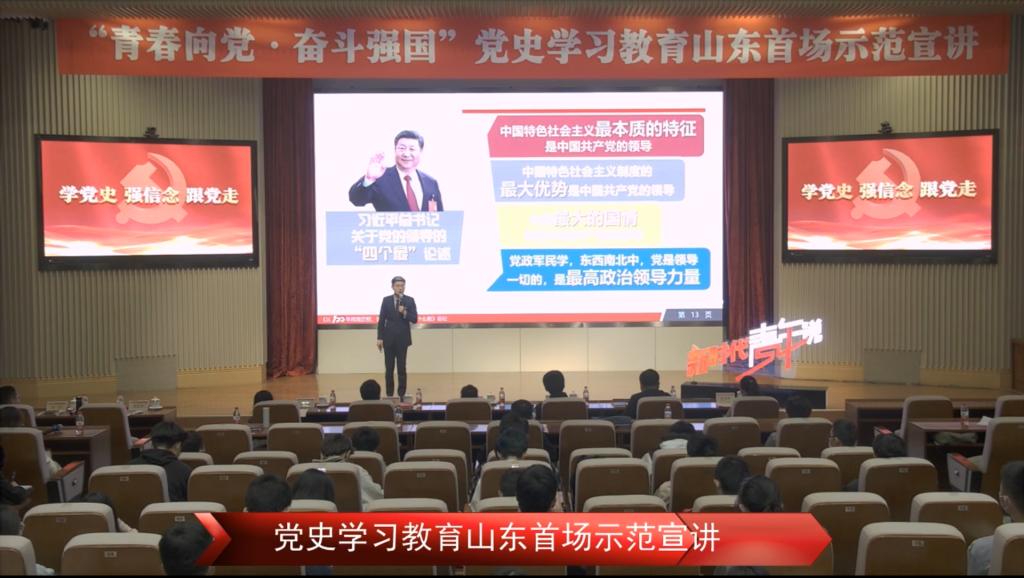 于4月16日上午九点半组织学生在线观看“青春向党·奋斗强国”党史学习教育山东首场示范宣讲会,百万青年同上一堂课,一起学党史。