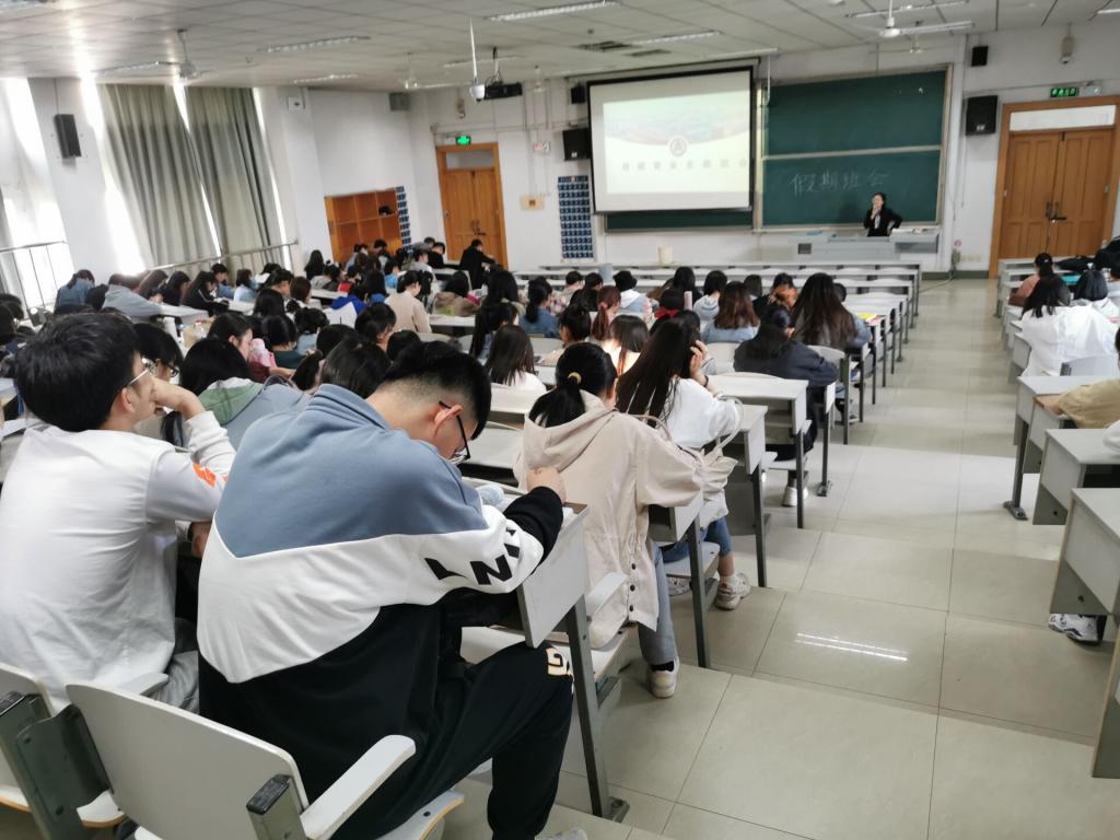 于4月28日下午5:00在综合教学楼706室开展考研指导班会,张风姣老师主持本次会议,2018级全体学生参加会议。