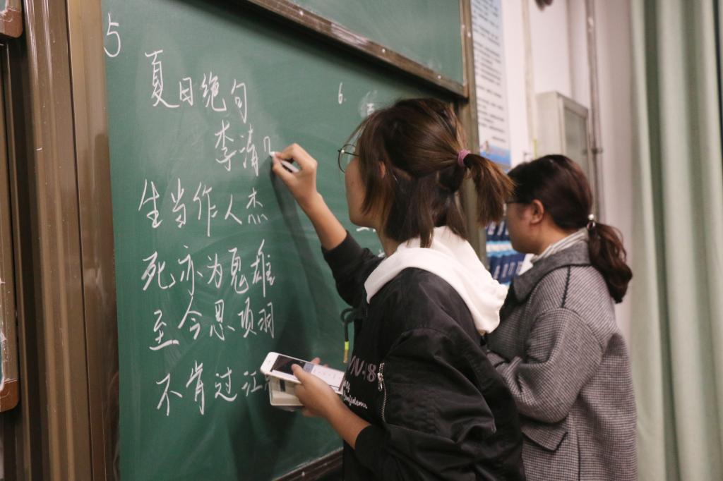 大赛开始,主持人首先宣读了比赛和评选规则。钢笔字书写时间为15分钟,粉笔字书写时间为15分钟,毛笔字的书写时间为20分钟。比赛分组进行,参赛学生认真地进行书写。主持人宣布时间结束后,老师对编号作品进行评分,老师认真谨慎并进行拍照对比评分。参赛学生平稳发挥,作品优秀。比赛最终按照成绩评选出三个项目的一等奖三名,二等奖三名,三等奖三名。