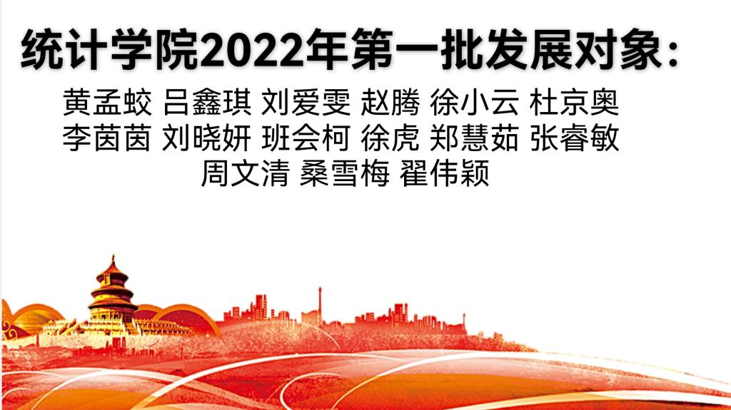 2022年第一批发展对象共有15人,分别为黄孟蛟、吕鑫琪、刘爱雯、赵腾、徐小云、杜京奥、李茵茵、刘晓妍、班会柯、徐虎、郑慧茹、张睿敏、周文清、桑雪梅、翟伟颖。这15位同学在学习中锐意进取,在生活和工作中态度端正,为学生起到了模范带头作用,作出了良好的表率。相信他们会在体育赛事直播