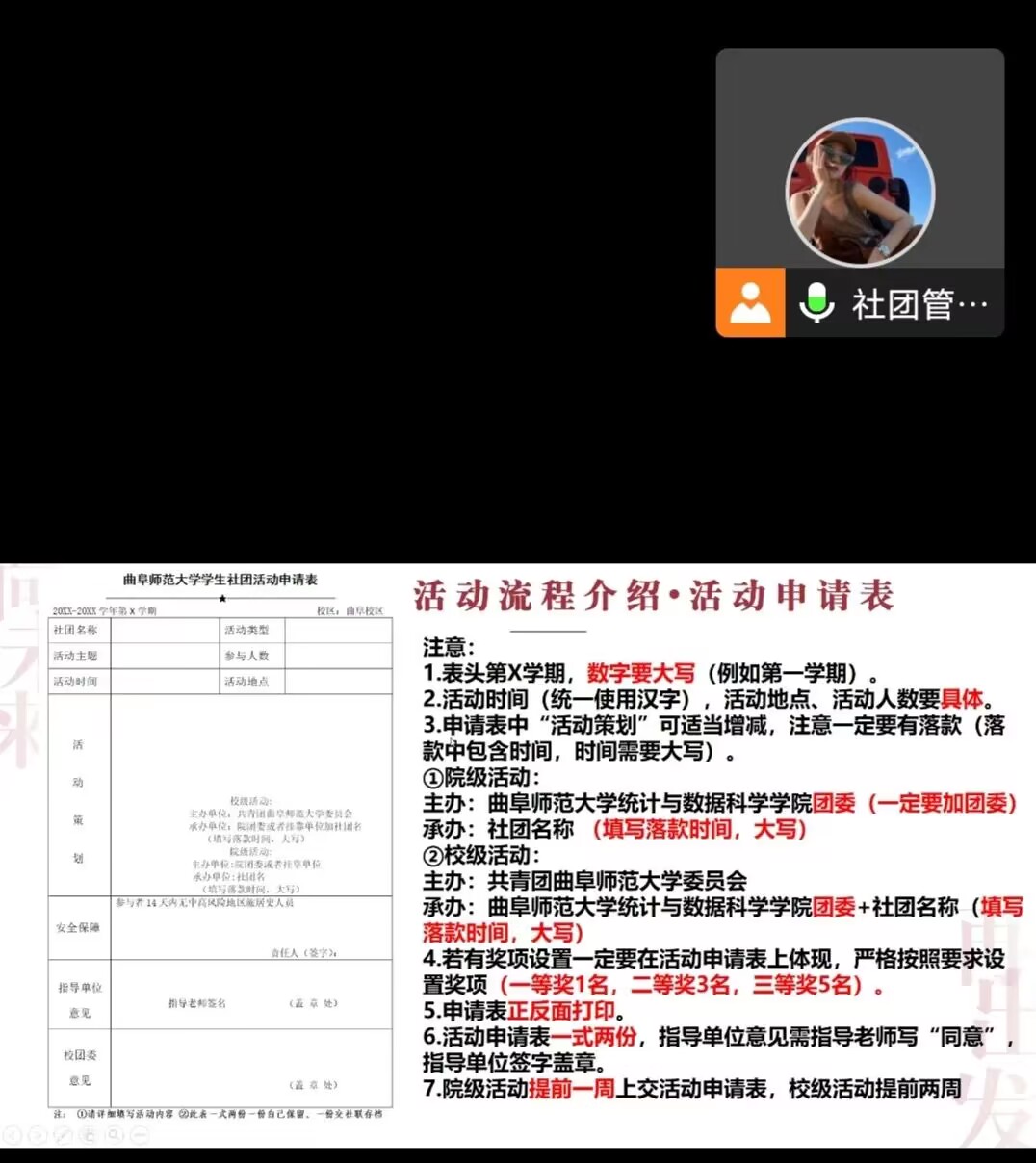 会议伊始,社团管理部成员带领参会人员学习党的二十大的相关内容,展示二十大主题、学习内容及启示意义。随后,社团管理部部长对社团举办活动的具体流程和各项重要文件注意事项等重点问题进行讲解,带领大家学习社团管理制度。会议最后,各社团负责人积极提问,社团管理部负责人耐心解答,展现出体育赛事直播