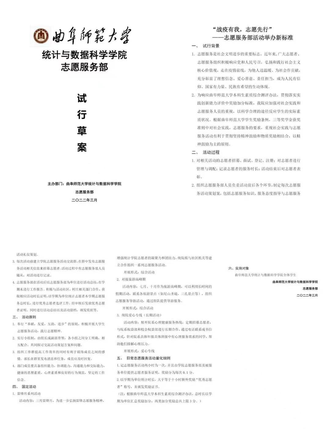 (通讯员:李凯运)为响应曲阜师范大学本科生素质综合测评办法,贯彻落实实践创新能力评价中奖励加分标准,统计与数据科学学院加强对社会实践和志愿服务人员的重视,以科学合理的途径反应学生的实际素质状况,制定并公布志愿服务部活动举办的新标准。