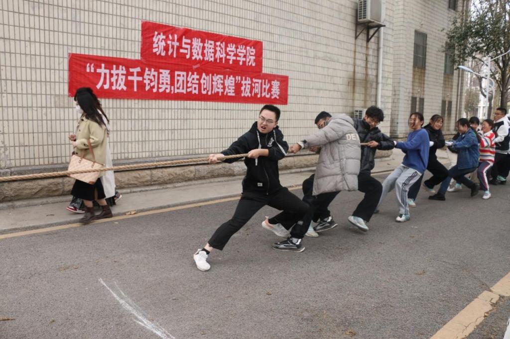 比赛分为初赛、复赛、决赛三个阶段,每个阶段的比赛采取三局两胜的赛制。比赛开始前,参赛者们在活动场地集合热身。比赛开始,各队负责人将队员进行排列,队员依次交错站在河界后拔河绳的两侧。当裁判员发出“预备”口令时,双方队员拉直拔河绳做好准备。鸣哨后,各方选手奋力将绳拉向自己的一方,老师及拉拉队成员为他们加油,经过一番激烈角逐后,拔河比赛圆满落下帷幕。最终2023级统计一班获得了比赛一等奖,2021级应用统计班获得二等奖,2022级统计二班获得三等奖,2023级统计二班获得了道德风尚奖。