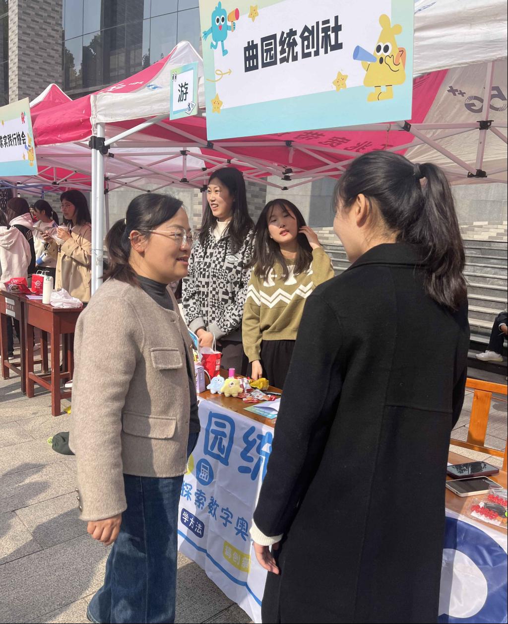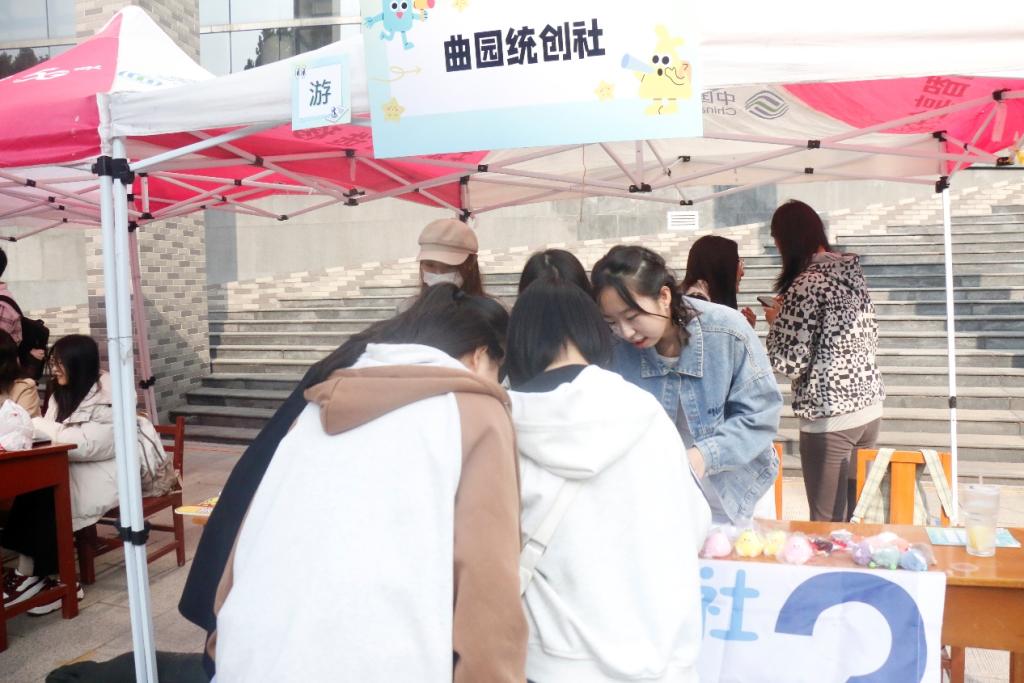 于 11 月 3 日在大学生活动中心前举办百团大战——社团纳新活动。曲园统创社、统计学社、家教协会面向全校同学招新,吸引了大批学生踊跃报名,体育赛事直播