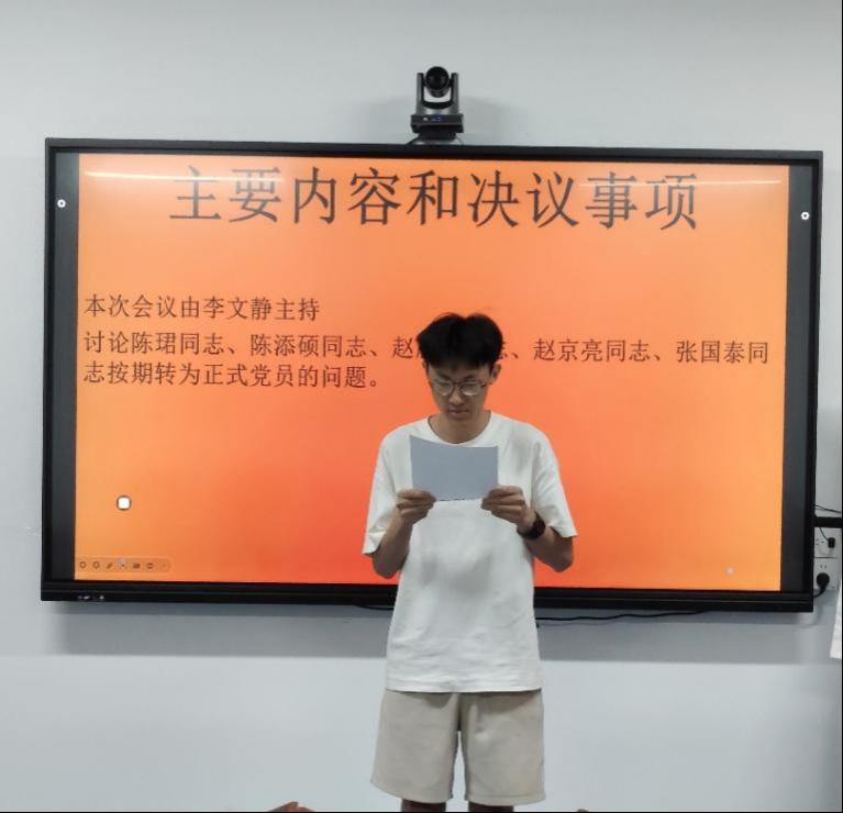 接着,由季中同志主持关于讨论陈珺、陈添硕、赵胜男、赵京亮、张国泰五位同志按期转为正式党员的问题。在转正对象依次宣读转正申请书后,支部党员进行无记名投票并宣布投票结果。随后,季中同志发表讲话,希望转正党员能够不忘初心,努力学习,充分发挥共产党员的先锋模范作用。