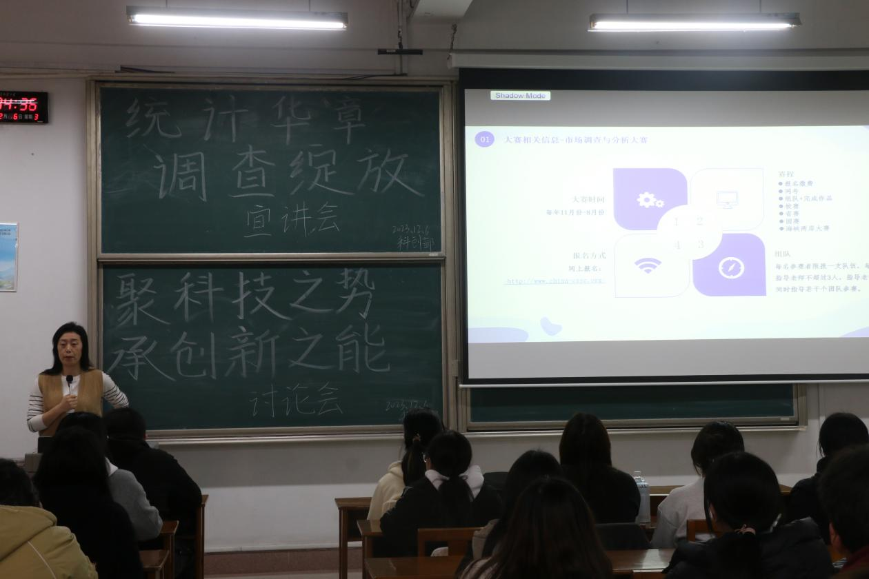 于12月6日下午3:30在综合楼303教室开展“统计华章,调查绽放”宣讲会。本次宣讲会由苏玉霞老师主讲,2022级和2023级同学积极参与。