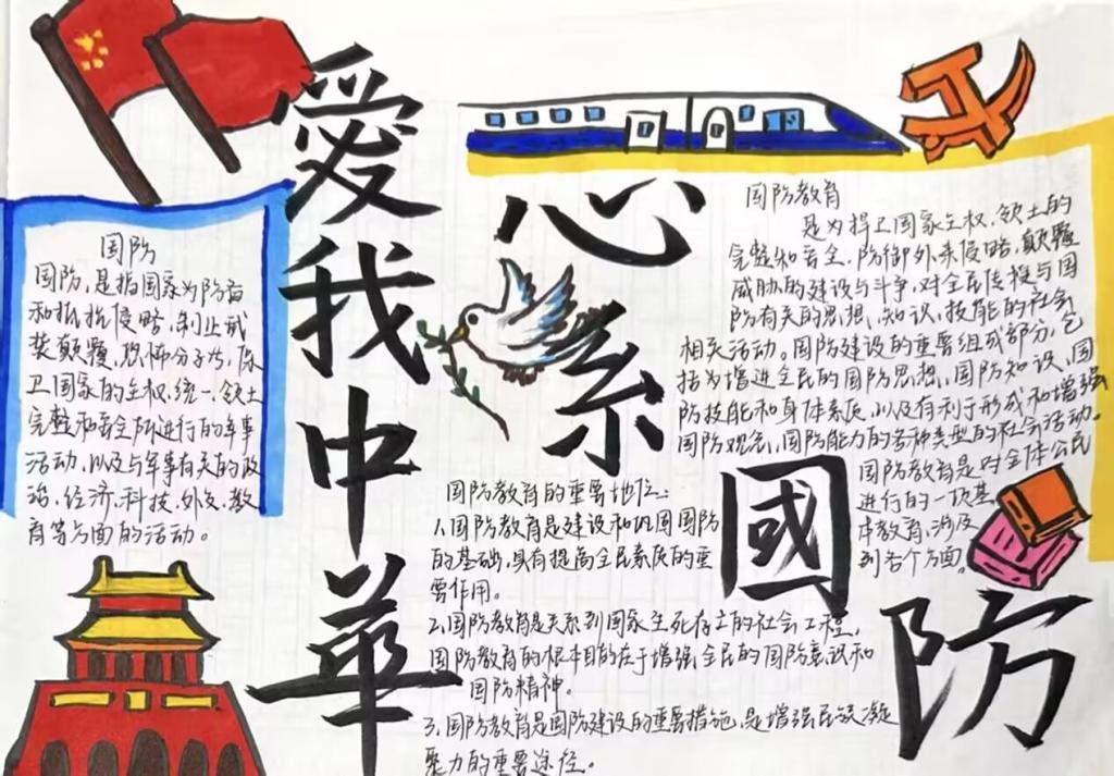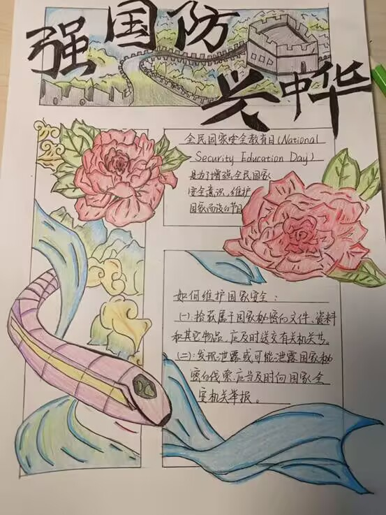 本次主题手抄报活动不仅为同学们提供了一个展示创意的平台,锻炼了他们的绘画创作能力,还引发了大家对国防精神的深入思考,使同学们深刻意识到国防教育的重要价值,激励广大青年在党的引领下奋勇前行,不畏艰难险阻。