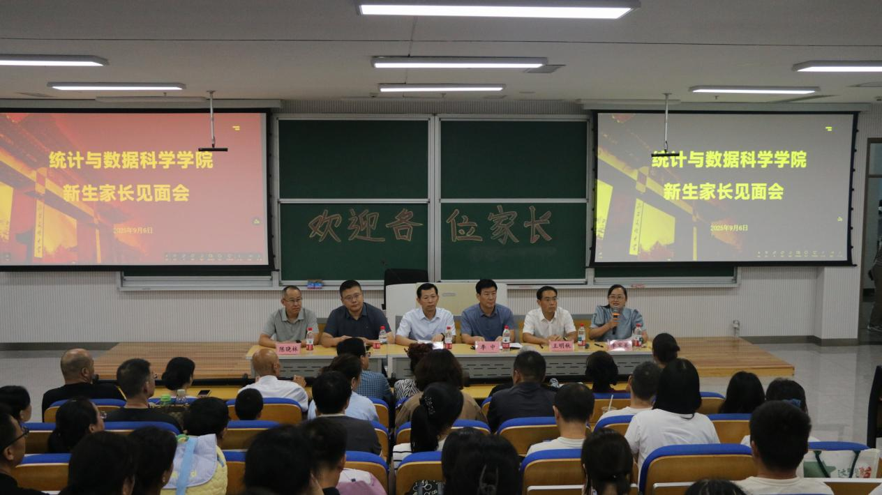 于致知楼B101举行新生家长见面会,院长赵胜利、党委副书记季中、副院长赵翔华、团委书记李宴美和统计系主任陈晓林、数据科学系主任王明秋,及2025级新生家长代表参加见面会,会议由体育赛事直播