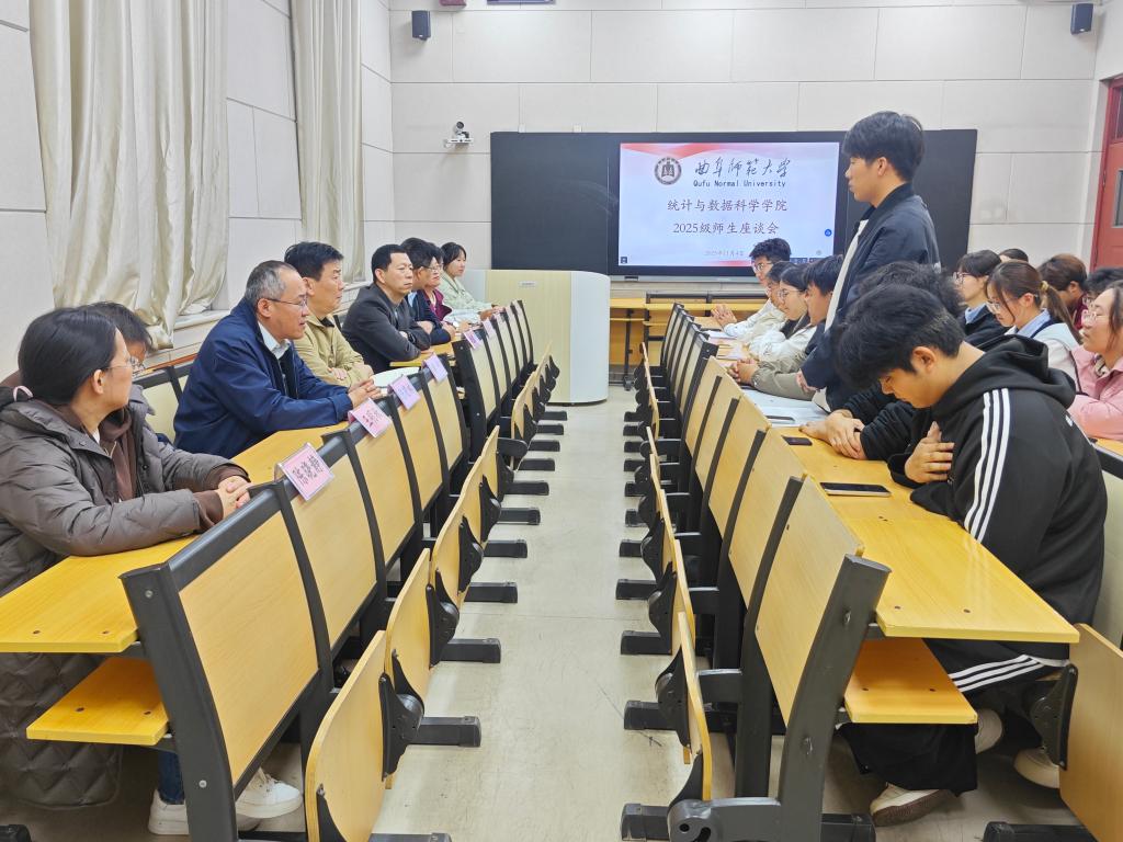 于文史楼211教室举办2025级师生座谈会。院长赵胜利、党委副书记季中、副院长赵翔华、团委书记李宴美、统计系主任陈晓林、数据科学系主任王明秋、教师代表陈晓静、2022级优秀学生代表及2025级新生代表参加座谈会,会议由体育赛事直播