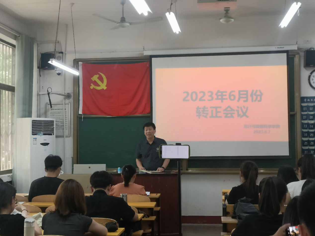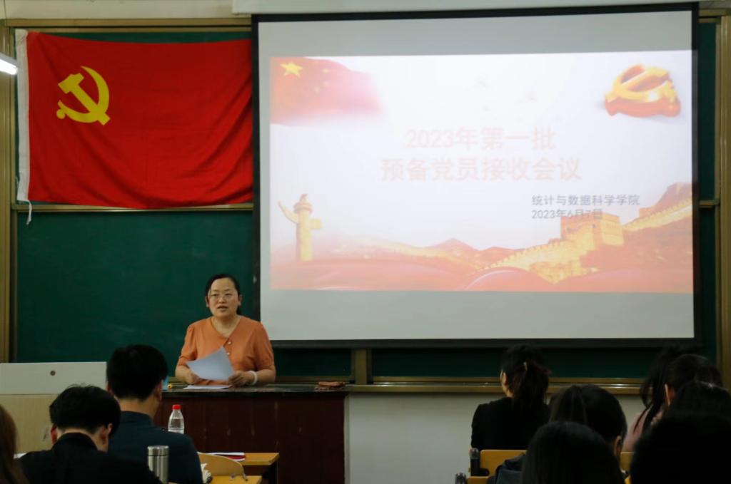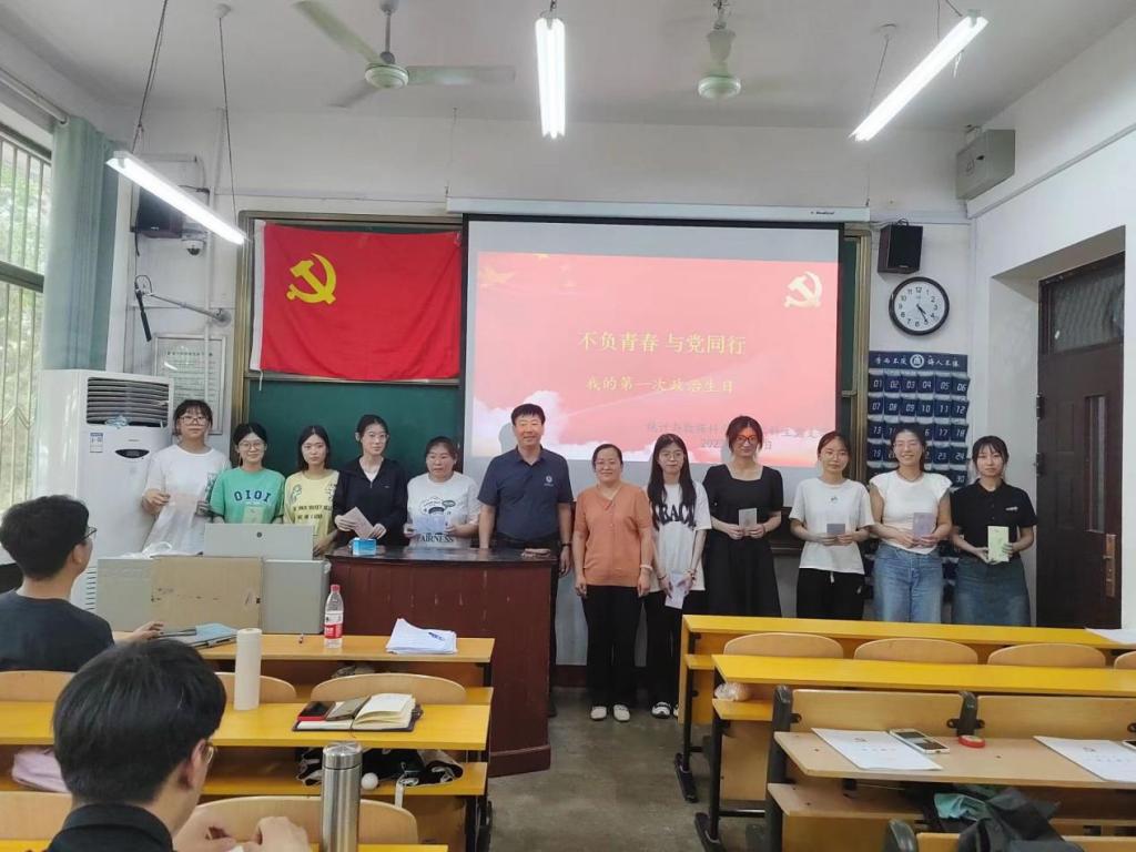 会议伊始,由发展对象宣读入党志愿书,预备党员宣读转正申请书,依次介绍自身情况和努力方向。经支部党员讨论和无记名投票,同意接收马欣妍、李亚妮等十位同志为预备党员,黄孟蛟、吕鑫琪等十七位同志按期转为中共正式党员,以上同志进行集体宣誓。接着,会议开展了“我的第一次政治生日”、“重温入党誓词”、“猜红歌比赛”活动,季中书记和李宴美老师为十名预备党员送上初心贺卡,庆祝他们光荣入党,并带领体育赛事直播