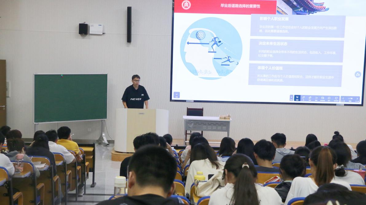 许睿同学进行了就业经历的分享,他为同学们介绍了毕业后道路选择的重要性,主要包括三个方面,即会影响个人职业发展、能够决定未来生活状态、体现个人价值观。他帮助同学们深刻意识到就业选择的重要性,从而激励同学们以更加饱满的热情和认真的态度投入到接下来的学习和日后的就业选择中。
