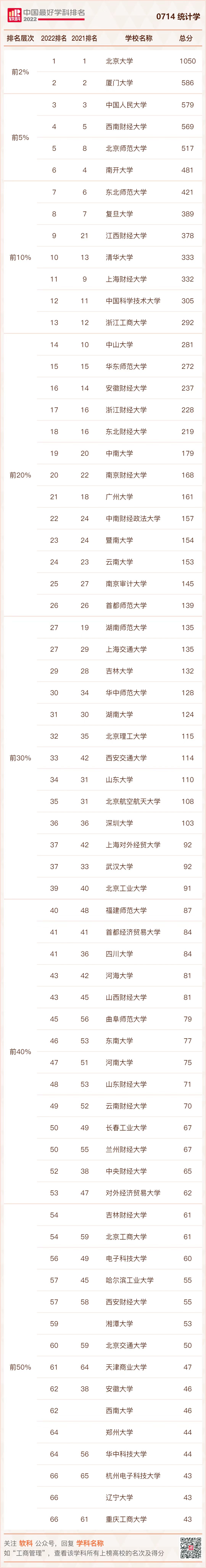 2022年9月21日,高等教育评价专业机构软科正式发布“2022软科中国最好学科排名”。排名榜单包括96个一级学科,各个学科排名的对象是在该一级学科设有学术型研究生学位授权点的所有高校,发布的是在该学科排名前50%的高校。共有484所高校的5035个学科点上榜。其中,统计学学科排名共有68所大学上榜,曲阜师范大学排名第45,较2021年排名第56,上升了11个名次,位列前40%。