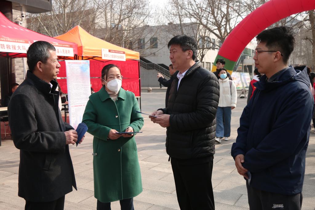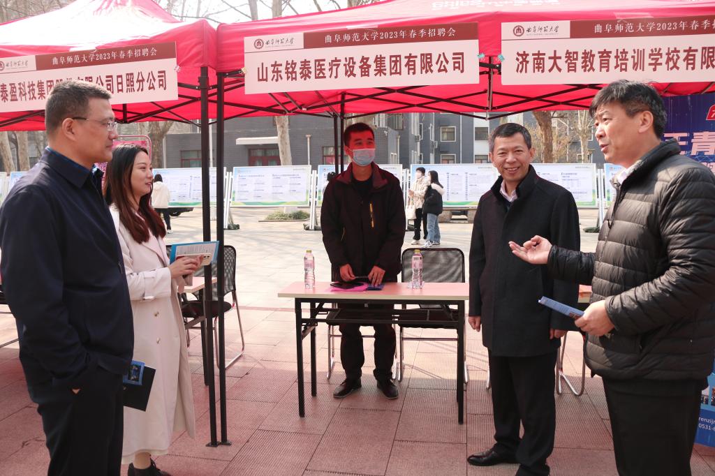 领导就招聘要求、工资待遇、应往届毕业生单位就业情况等与参会单位进行沟通,在充分了解用人单位的同时,为招聘会顺利召开和学生就业工作提供指导。招聘现场还开设专区,由各体育赛事直播